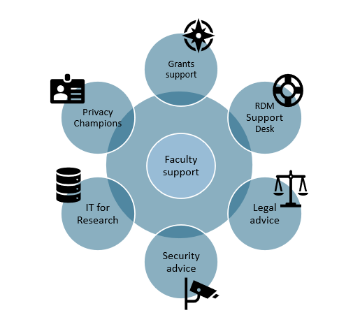 Research Data Management is supported by various departments at VU Amsterdam, all providing support on the topics shown in the overview above. Apart from that, all faculties have teams providing research data support for their own faculty members. In most cases this is the first line of support for researchers to start their inquiries.